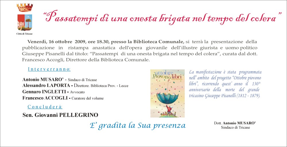Venerdì 16 ottobre 2009, alle ore 18.30, presso la Biblioteca Comunale di Tricase – sita in via G. Toma – avrà luogo la presentazione della pubblicazione in ristampa anastatica dell’opera giovanile dell’illustre giurista e uomo politico Giuseppe Pisanelli dal titolo: “Passatempi di una onesta brigata nel tempo del colera“, curata dal dott. Francesco Accogli, Direttore della Biblioteca Comunale