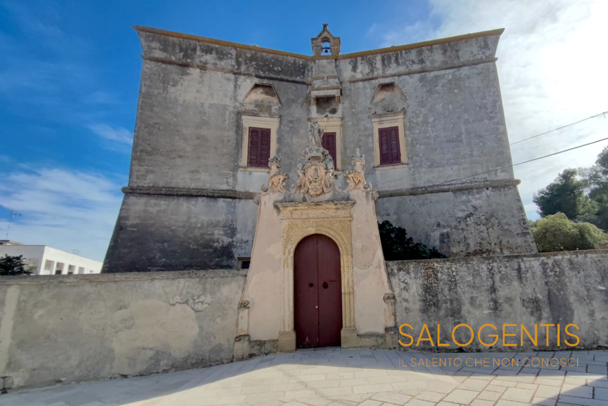 Proprio agli ultimi feudatari è attribuito il Palazzo Baronale D’Amely, chiamato anche castello fu realizzato da Gian Giacomo dell’Acaya nella seconda metà del Cinquecento, su commissione di Pompeo Paladini settimo barone di Melendugno e Lizzanello. L’edificio si configura come una torre poligonale a pianta stellare appartenente all’architettura militare di scuola toscana e marchigiana, alla quale vengono, successivamente, affiancate altri corpi di fabbrica per aumentare la disponibilità di spazi interni. La torre alta 12,50 metri con mura di 4,5 metri, presenta una base scarpata e una facciata divisa da due tori marcapiano; un tempo circondata dal fossato che attualmente è stato coperto da sovrastrutture successive, sorgeva isolata rispetto alla cerchia delle mura medievali che cingeva l’abitato, tale scelta sanciva la definitiva perdita di efficacia dell’antico sistema basato sulla cinta muraria con torri ad essa addossate in corrispondenza delle porte.