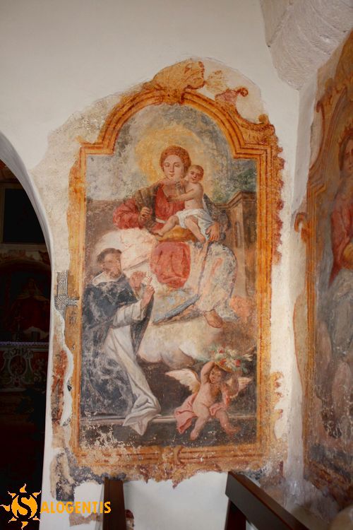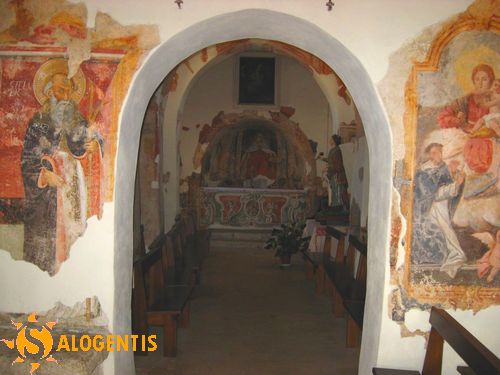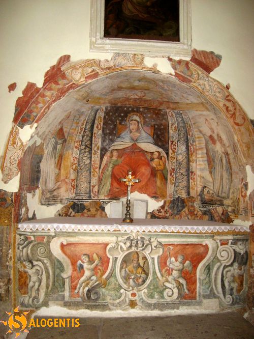 Nel corso dei secoli l’ambiente interno ha subito numerose modifiche architettoniche, a tal proposito si annovera sulla controfacciata la scena dell’Ascensione e di Santa Barbara affiancate ad altre figure che fanno parte dello strato più antico del X secolo. Nella zona dell’abside, anch’essa molto antica, sono visibili le raffigurazioni di sei o di otto santi vescovi, riconoscibili nei Padri della Chiesa Orientale: San Basilio, San Giovanni Crisostomo e San Gregorio Nazianzeno, il sacro gruppo è effigiato secondo il rito greco ortodosso ed ogni singolo personaggio stringe nella mano sinistra l’Evangelario, mentre nella destra accenna al segno della benedizione. Proseguendo lungo le zone laterali troviamo nel primo arco di sinistra un affresco raffigurante una consacrazione di San Nicola diacono; nel secondo invece sono presenti sia dei dettagli (remo di una nave e il volto del Santo) che altri particolari corrispondenti alle storie mariane come quella riferibile al miracolo dell’apparizione del Santo sulla chiglia di un’imbarcazione. Il successivo,affrescato sull’arco, riguarda probabilmente stralci agiografici riconducibili all’episodio in cui Nicola,trattenutosi nella città di Plakoma in Licia, abbatte un cipresso infestato da demoni. In fine il quarto ed ultimo “fresco” si trova nella parte opposta al secondo arco di destra, dove in maniera poco visibile alla destra di San Nicola vi è raffigurato un edificio in decadenza.