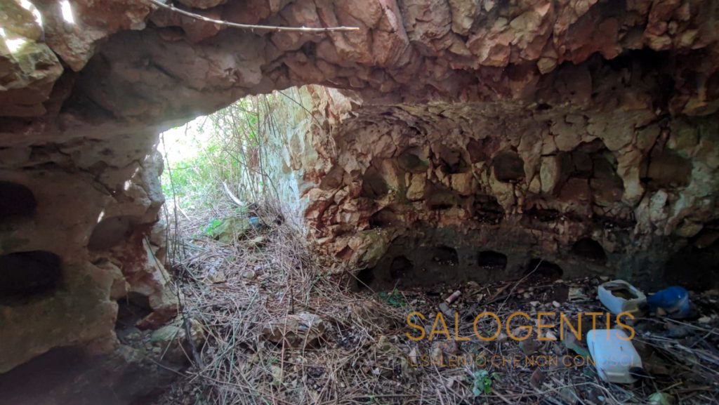 Nel 2012 i riflettori si spostano su un ulteriore, probabile, tomba a grotticella nel territorio di Montesardo, sulla parete occidentale di un grande sbancamento antistante la clinica San Raffaele colmato da terra rossa e bassa vegetazione spontanea. Si tratta di una cavità orientata in direzione nord-est, con un’apertura sul lato orientale costituita da un breve dromos di accesso che immette in un ambiente di forma ellittica. La volta si caratterizza per la presenza di un foro di aerazione, mentre le pareti laterali presentano numerose nicchie, una sovrapposta all’altra, dall’enigmatica funzione e incerta datazione[4]. L’ambiente era già noto ai soliti vandali e incivili che hanno saputo reimpiegare come “sito di discarica”, ovviamente abusivo.