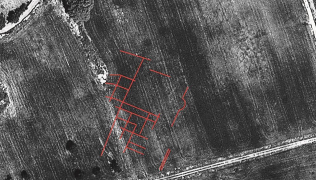 Analizzando le tracce sulle anomalie della composizione del terreno dovuta alla presenza di strutture in pietra interrate (che risulta in un differente contrasto cromatico in foto) è stato possibile delineare il perimetro di alcuni edifici su una superficie di circa 50x60metri e su un’area più vasta, di circa 200×150 metri, sono stati recuperati frammenti di ceramiche e altro materiale edile.