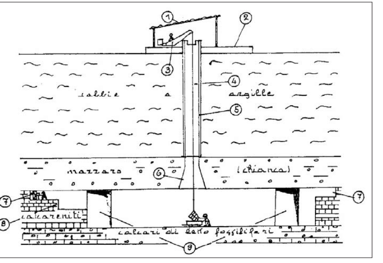 4) pozzo principale; 5) rivestimento; 6) campana; 7) fassa; 8) bancata; 9) galleria. [De Pascalis A., De Pascalis F., Parise M.]